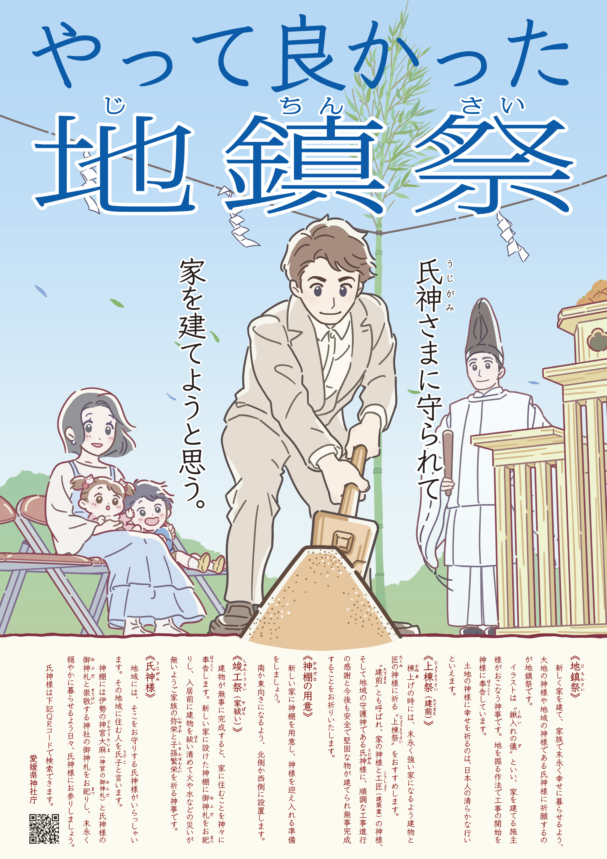 新しく家を建てる時、土地と建物の神様にご加護を願い、土地を祓い、工事の安全と家屋に住む人の幸福を祈る祭りです。